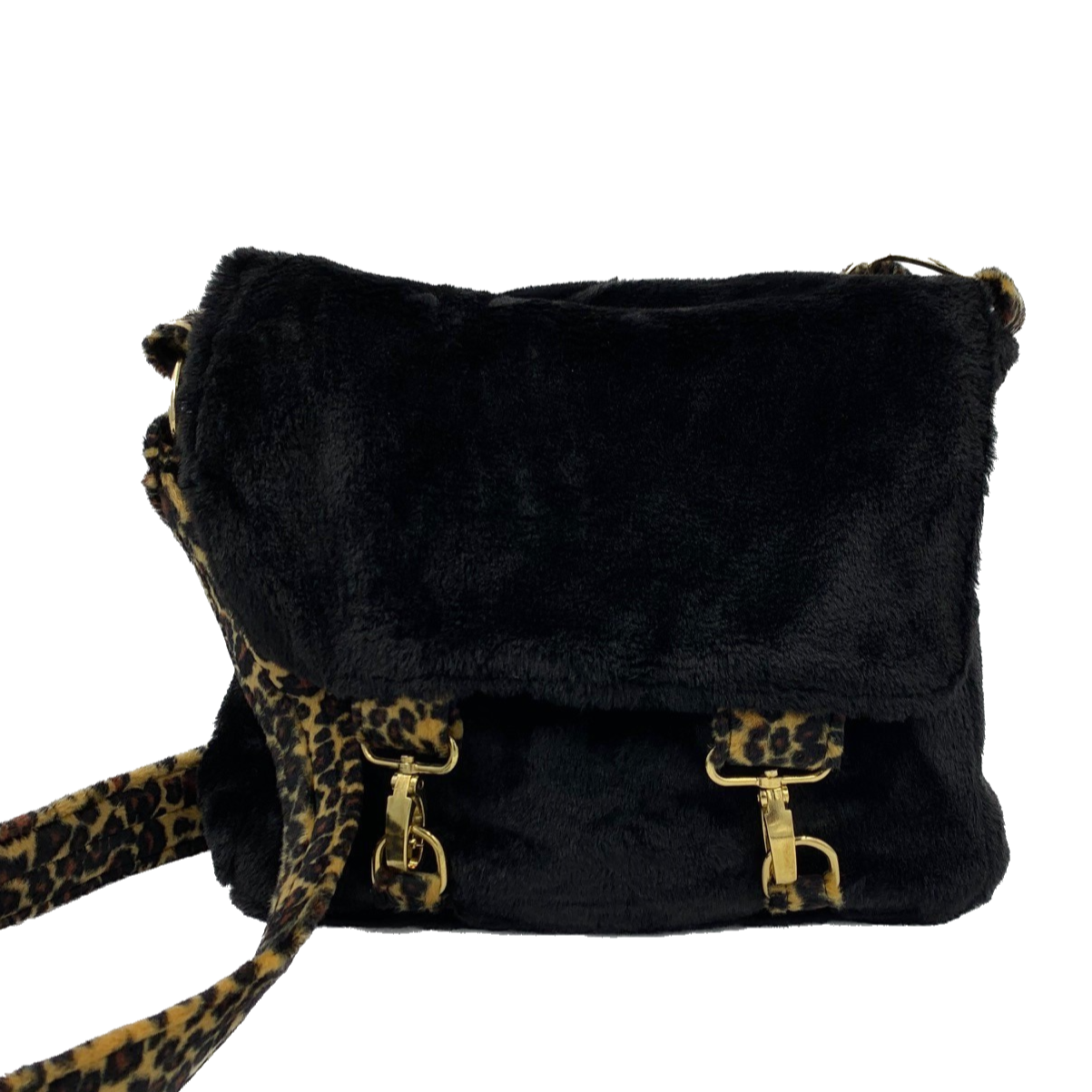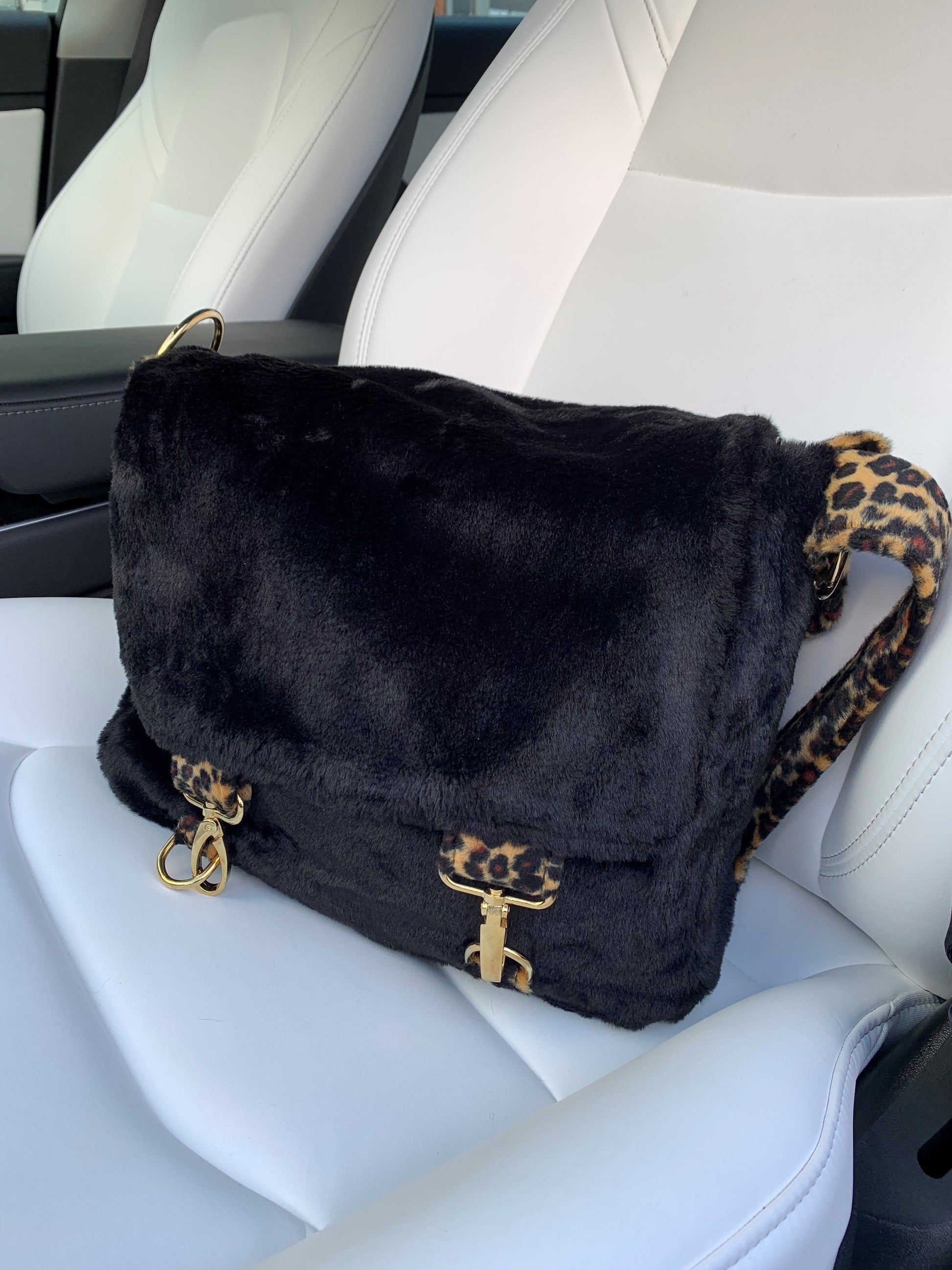 Black Faux Fur Satchel Bag with contrasting animal print strap