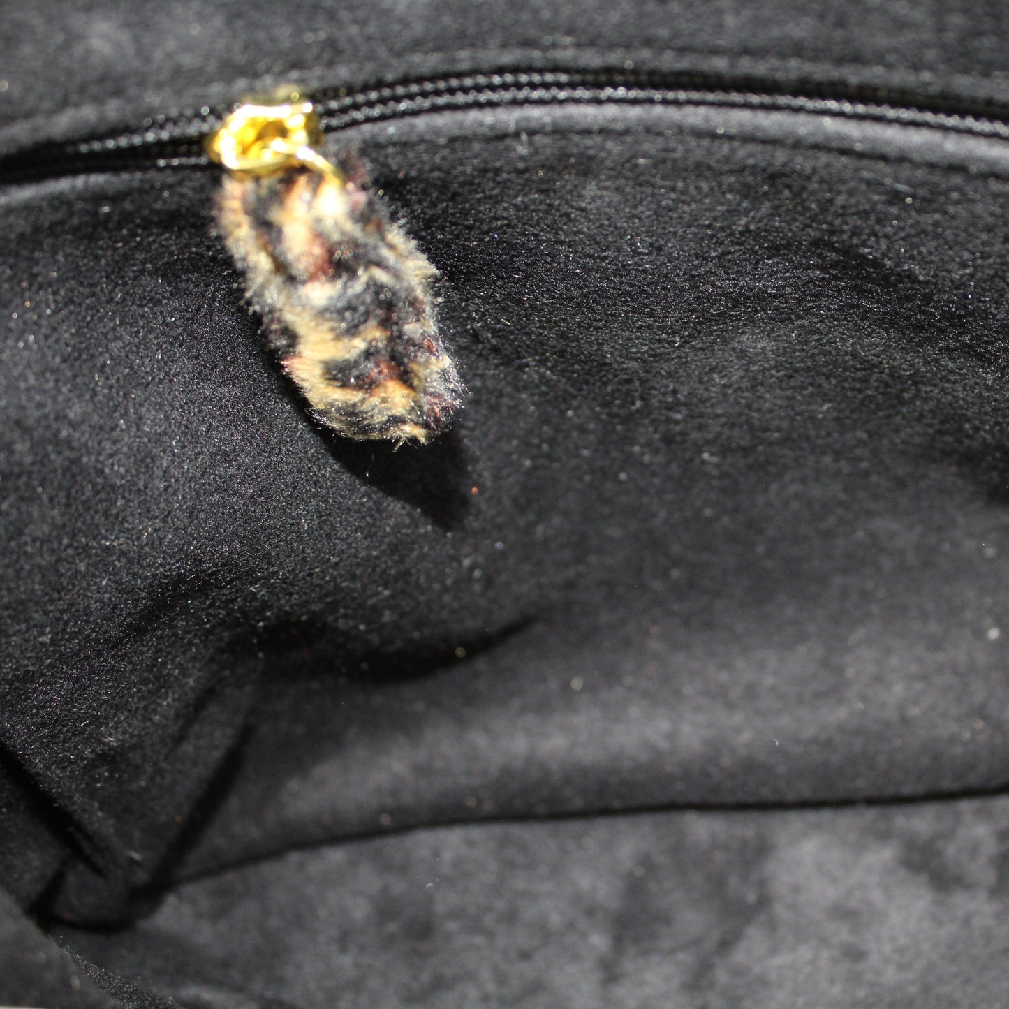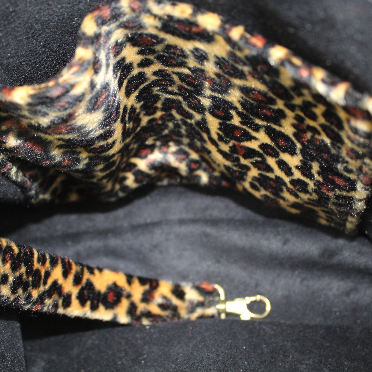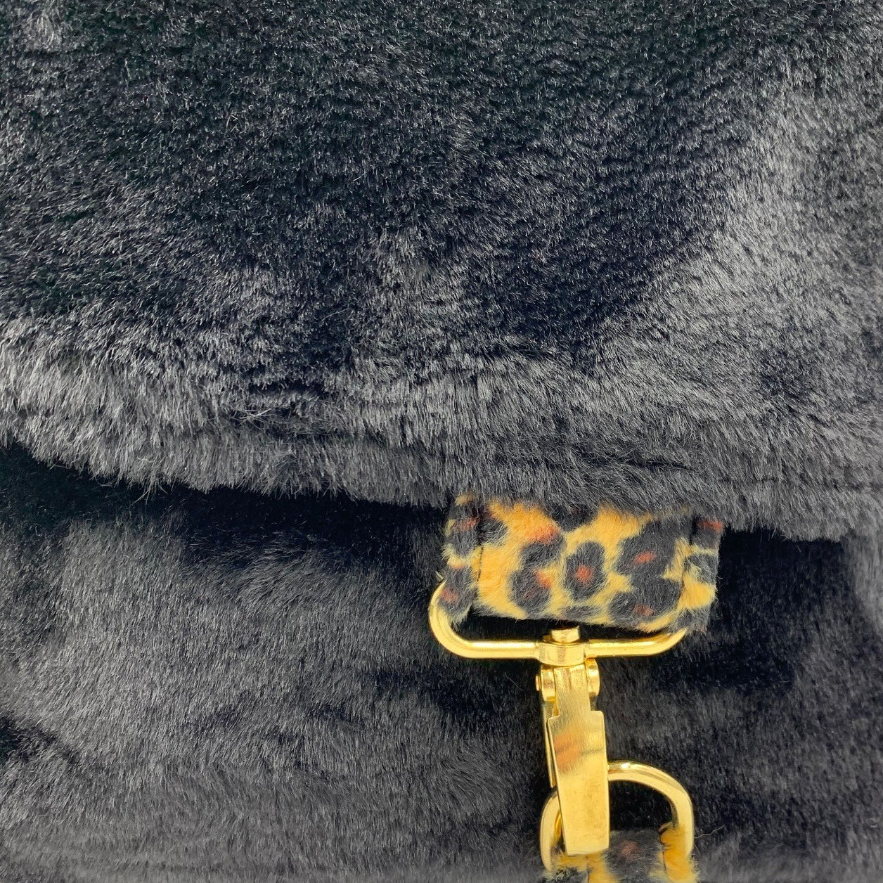 Exterior: Black Faux Fur with contrasting Golden Sand Leopard strap and accents